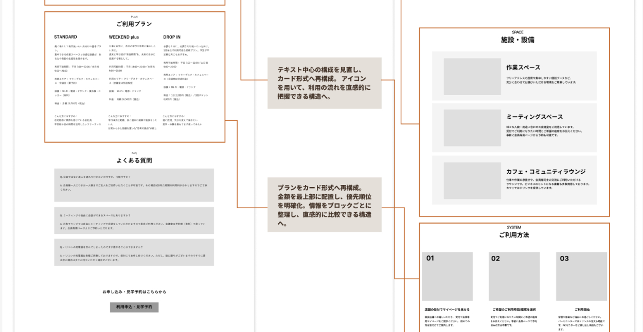 【SHElikesPROデザイナー制作課題】 コワーキングスペースのLP制作。既存会員の利用促進と、非会員への認知拡大を目的に、ワイヤーフレームの再設計からデザインカンプ制作までを行いました。