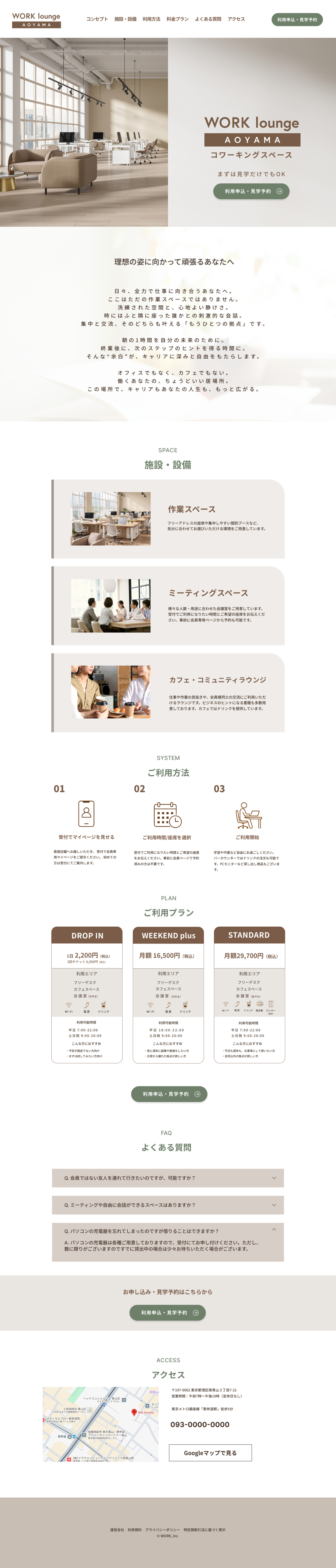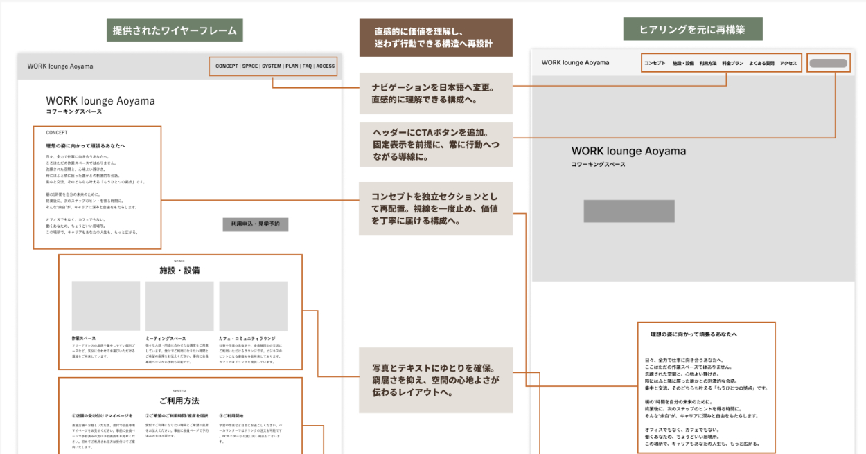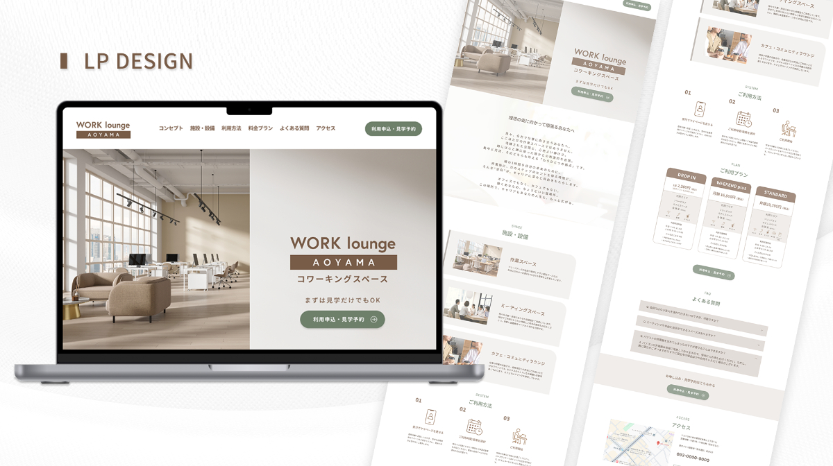 WORK.incが展開するコワーキングスペース「WORK lounge AOYAMA」の新規会員獲得を目的としたLP制作。ヒアリング動画をもとに要件定義を行い、ワイヤーフレームの再設計からデザインカンプ制作まで行いました。広告・SNS流入後の「申込」「見学予約」をゴールとし、直感的に理解できる構造への再設計を行っています。