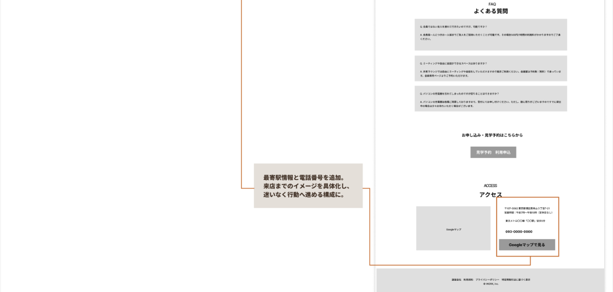 電話番号は視認性を高め、来店までのイメージが具体的に浮かぶように設計。