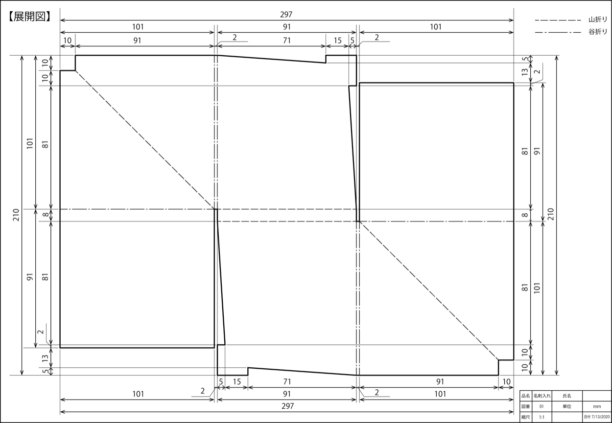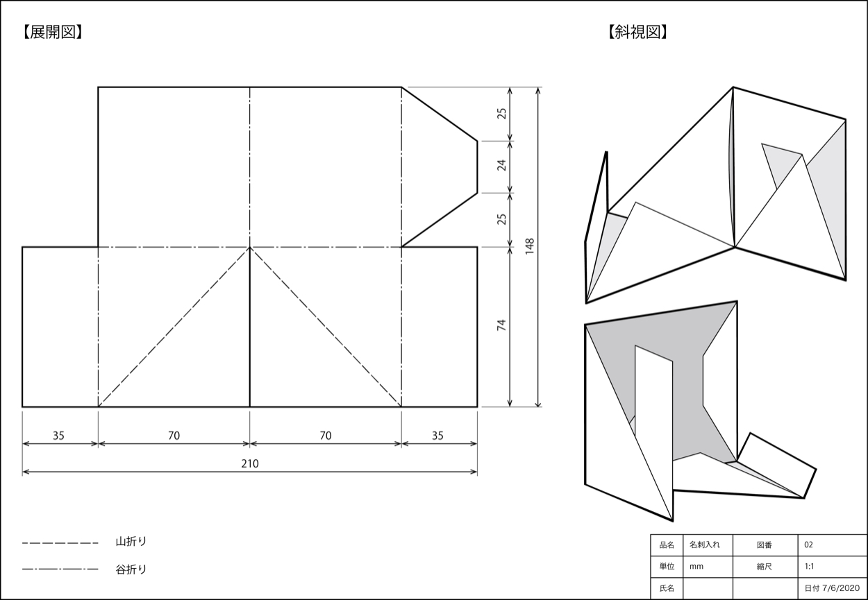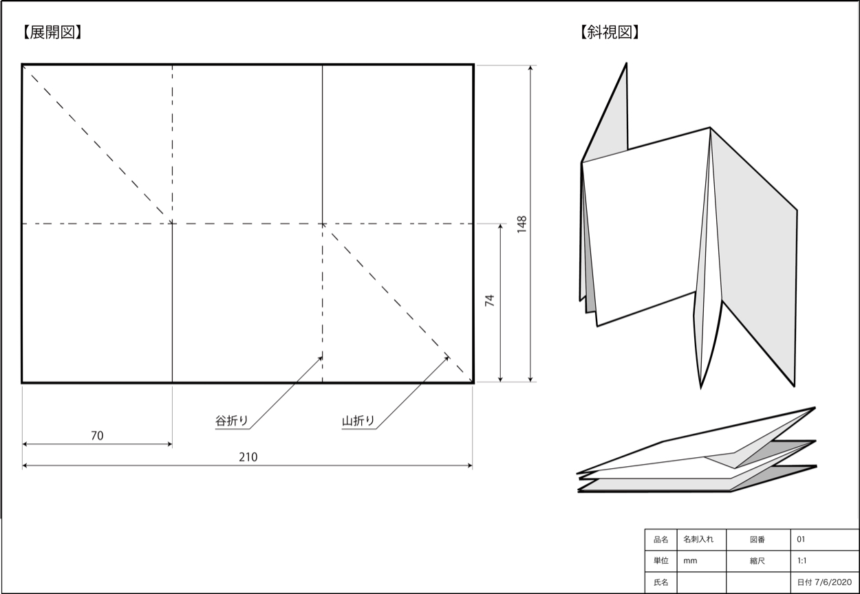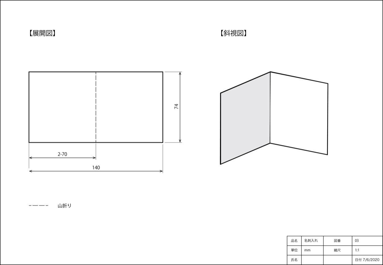 名刺ケースのプロトタイプを紙で作り、それを図面に起こしました。
