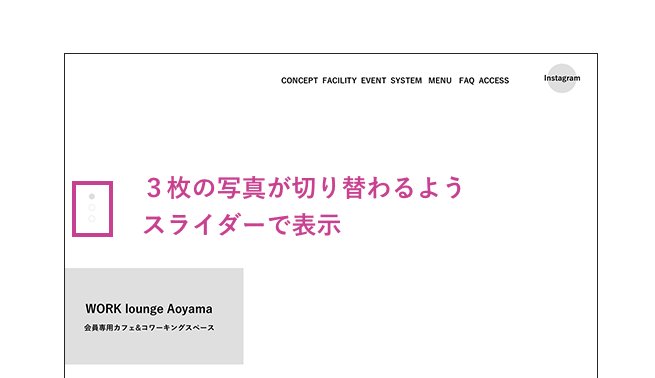 最初は店内の写真をいくつか載せたコンテンツを作ろうとしたが、コンテンツを1つ追加することでLPが長くなってしまい、離脱率が高くなってしまうことを恐れ、メインビジュアルで3枚の写真が切り替わるスライダーを取り入れ、店内の様子がわかるように工夫した。