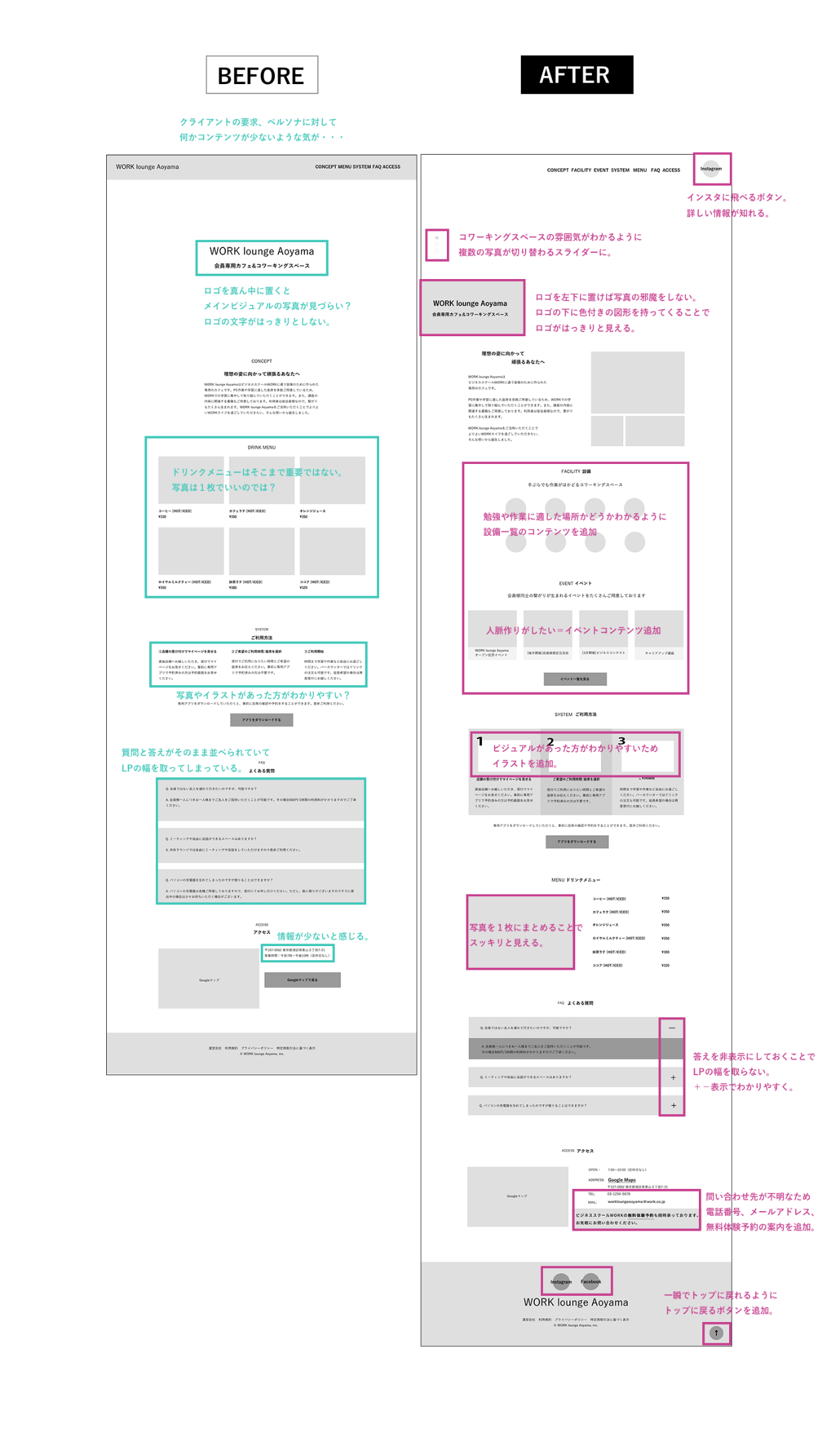 また、クライアントが用意したワイヤーフレームであってもデザイナー目線で足りないコンテンツは足したり引いたりすることが大事で、なぜ必要なのか、そしてなぜ不要なのかをきちんと考え、言語化できるようにすることが大切だと学びました。