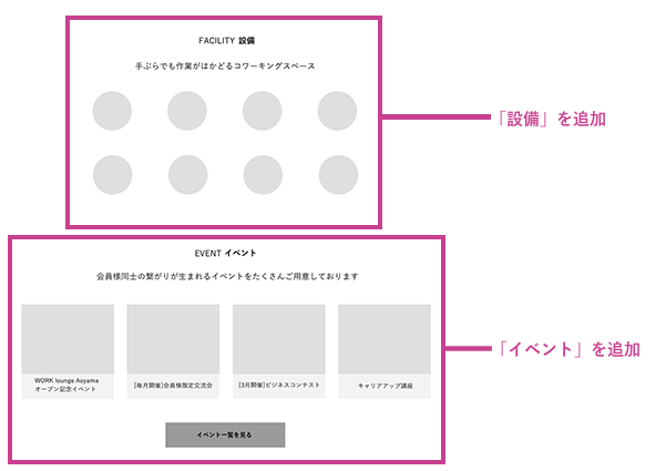 設備やイベントのコンテンツを優先的(上部)に配置した。