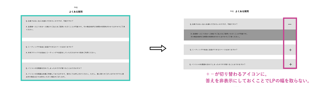 +−が切り替わるようなボタンにすることで、質問の回答を非表示にしておくことができ、LPの縦幅をなるべく縮小させる工夫をした。