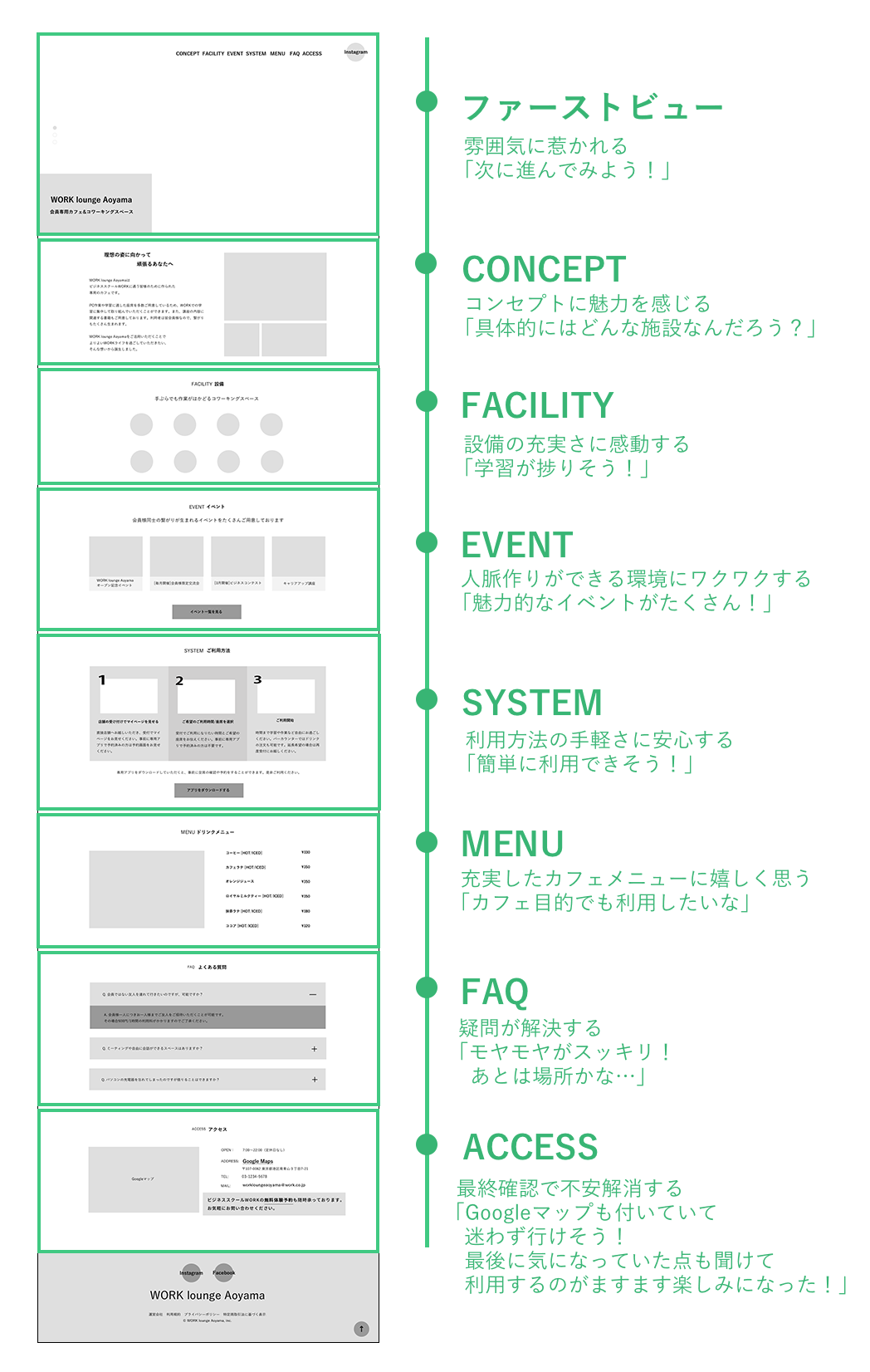 SNSはLPでは見えないリアルタイムな様子を知ることができ、親しみやすさを感じさせることができるのではないかと考え、InstagramやFacebookなど、外部のSNSサービスへ飛ぶことのできるリンクボタンを追加。ターゲットは20〜30代の女性ということでInstagram利用者が多く、また写真メインのSNSの方が店内の様子を知ることができると考え、InstagramとFacebookを選択した。