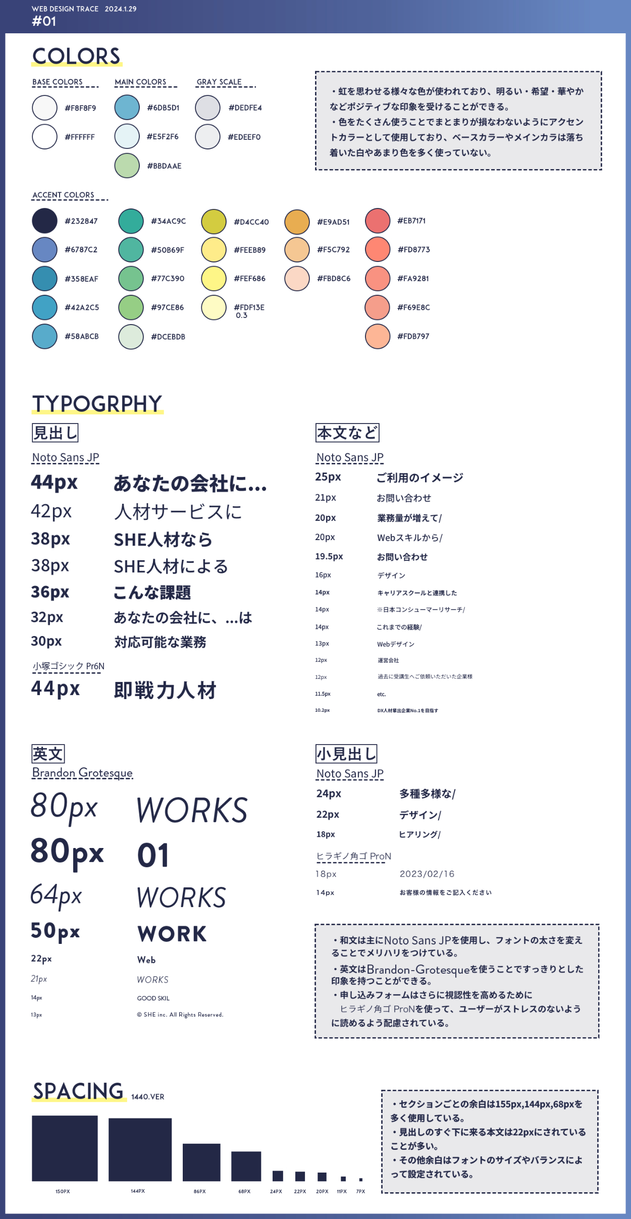 ・COLORS/TYPOGRPHY/SPACINGに分けて作成しました。検証ツールでレイアウトを読み取り、デザインの意図を考えました。