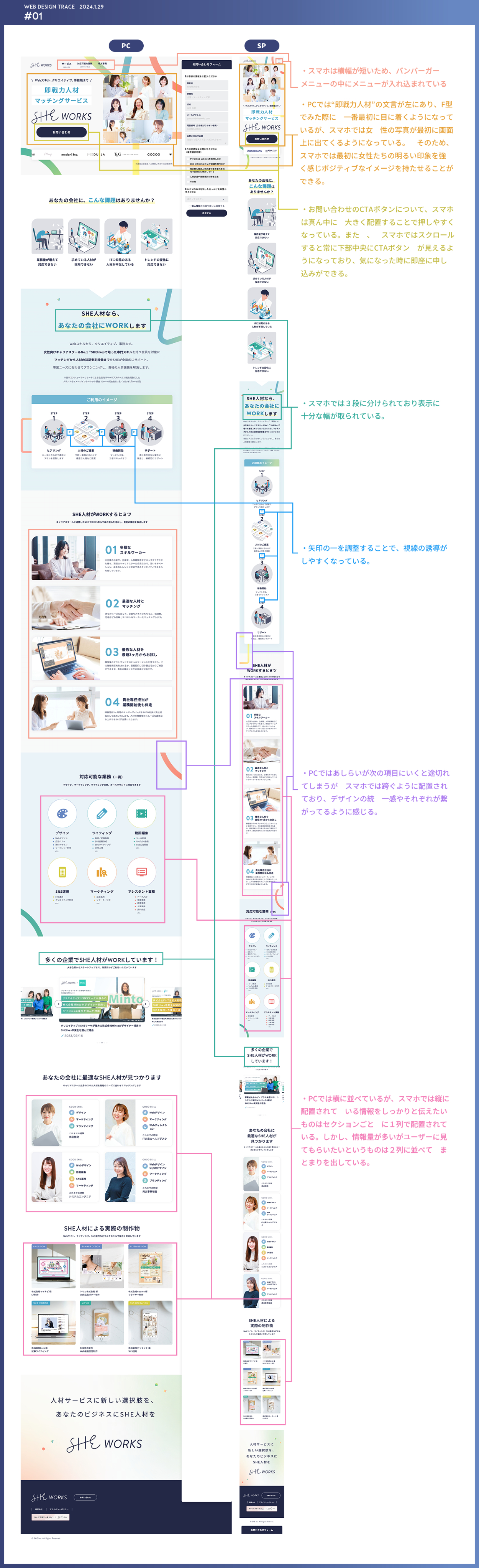 ・PCでは横並びだがSPになると何故縦並びになるのか情報の優先度やユーザーに伝えたい内容などを汲み取って分析をしました。