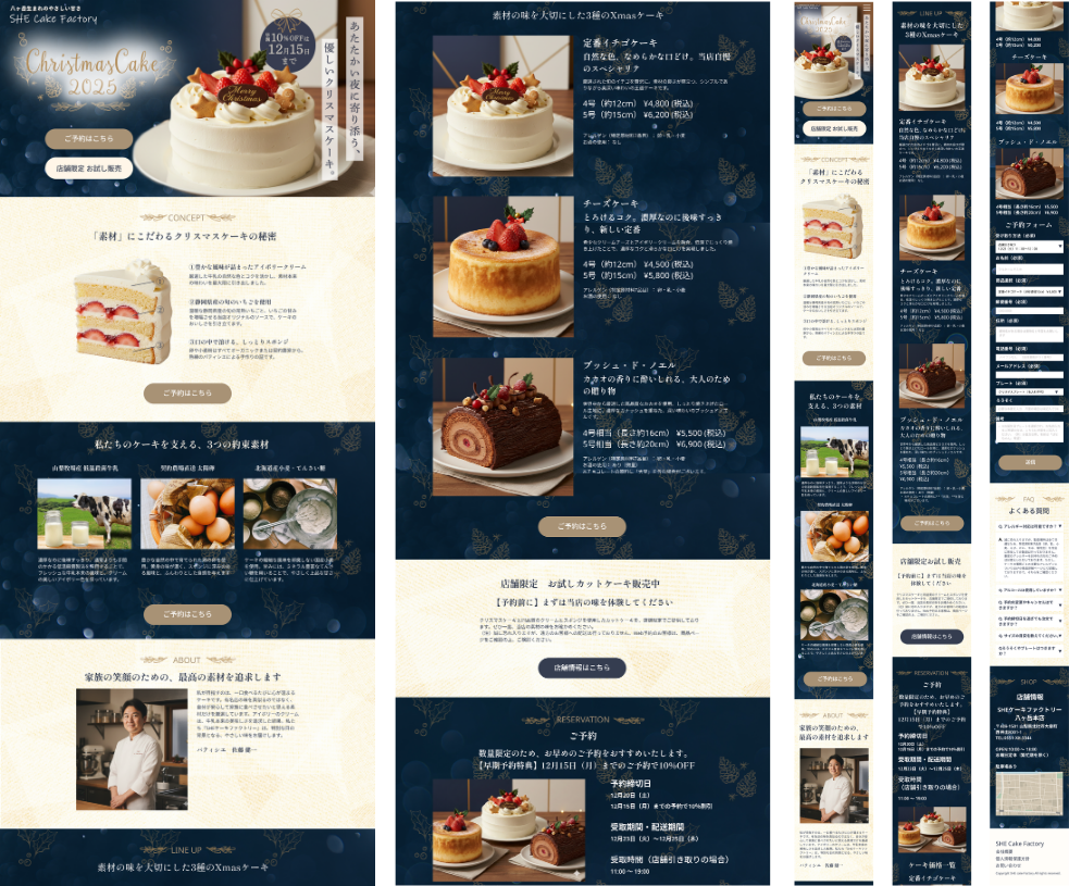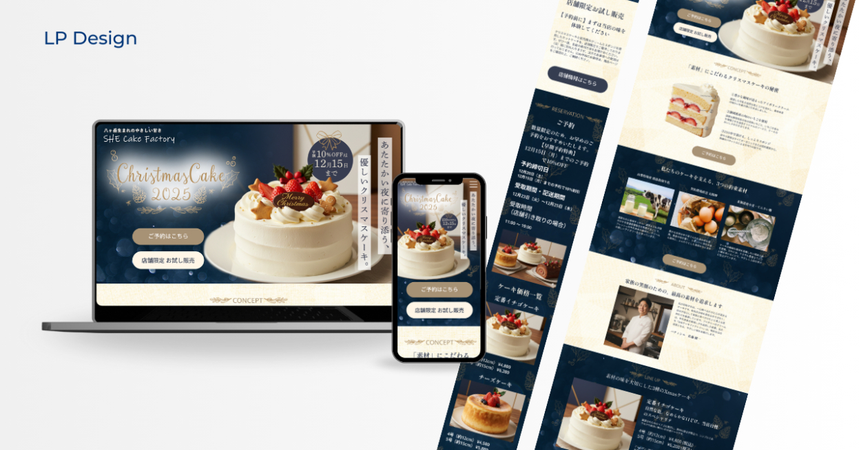 百貨店、大手チェーン、有名パティスリー、コンビニエンスストアなど、予約・販売チャネルが多岐にわたり、競争が激しい中で、「なぜSHEcakefactoryを選ぶべきか」という明確な差別化要因(USP)、心理的リスクを低減する施策を顧客に強く打ち出すためのLPを考えた。