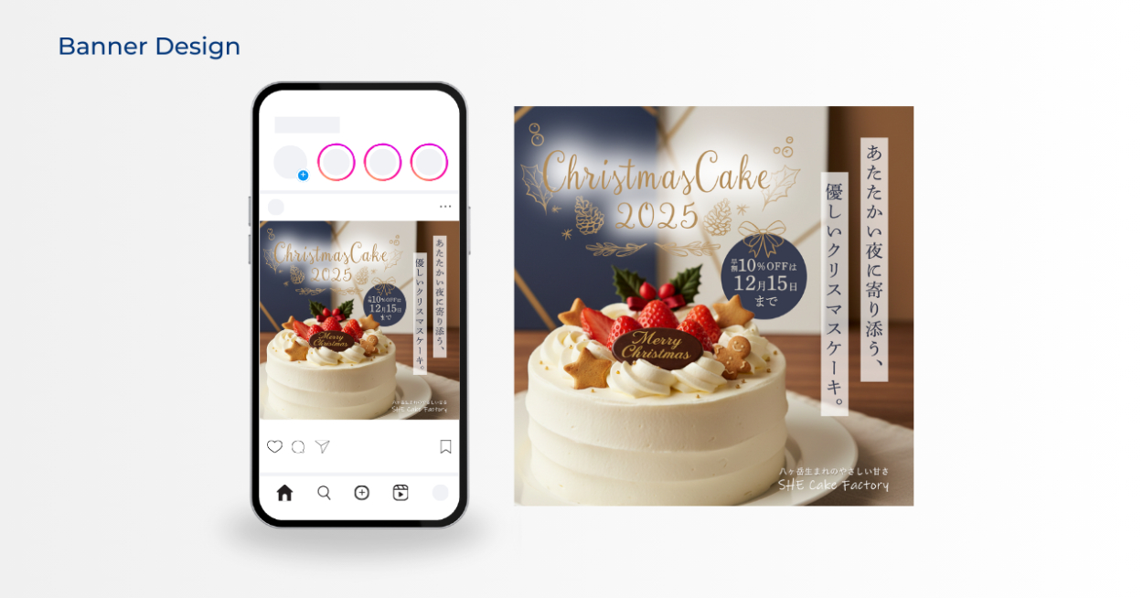 「オーガニック・やさしさ・家族向け」を軸に、「原材料にこだわる八ヶ岳のケーキ屋」を想定し、ペルソナ分析から世界観設計まで行ったクリスマスケーキ予約促進バナーを作成。