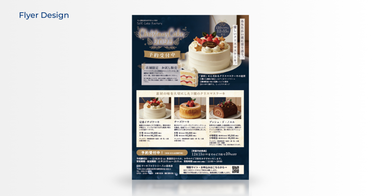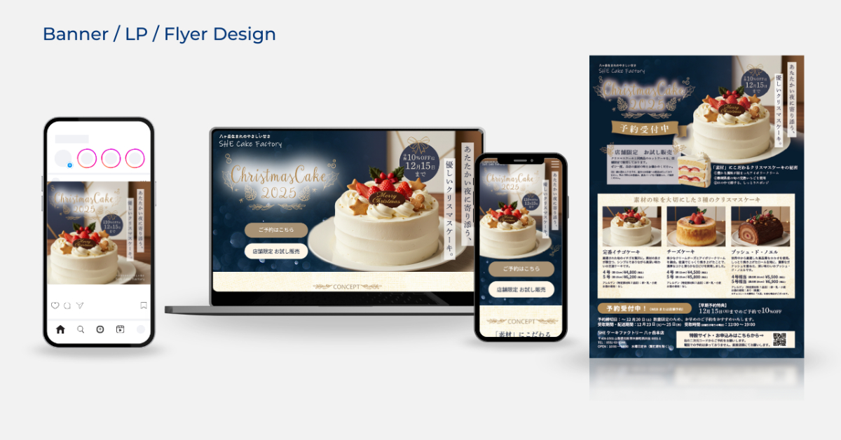 【自主制作】クリスマスケーキ予約キャンペーン 広告バナー、LPデザイン、チラシデザイン