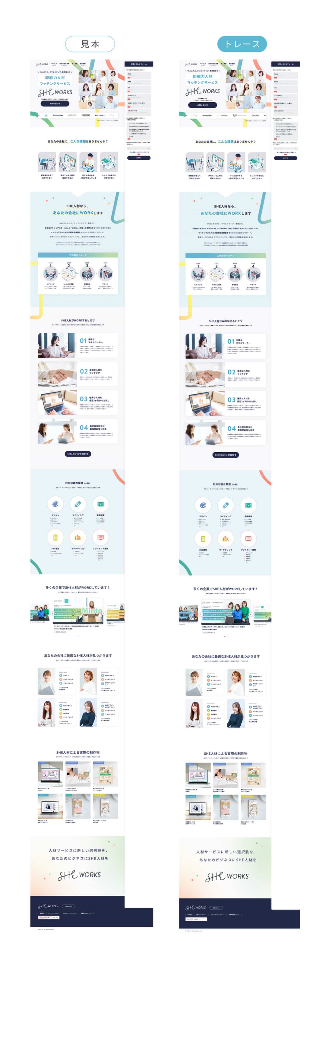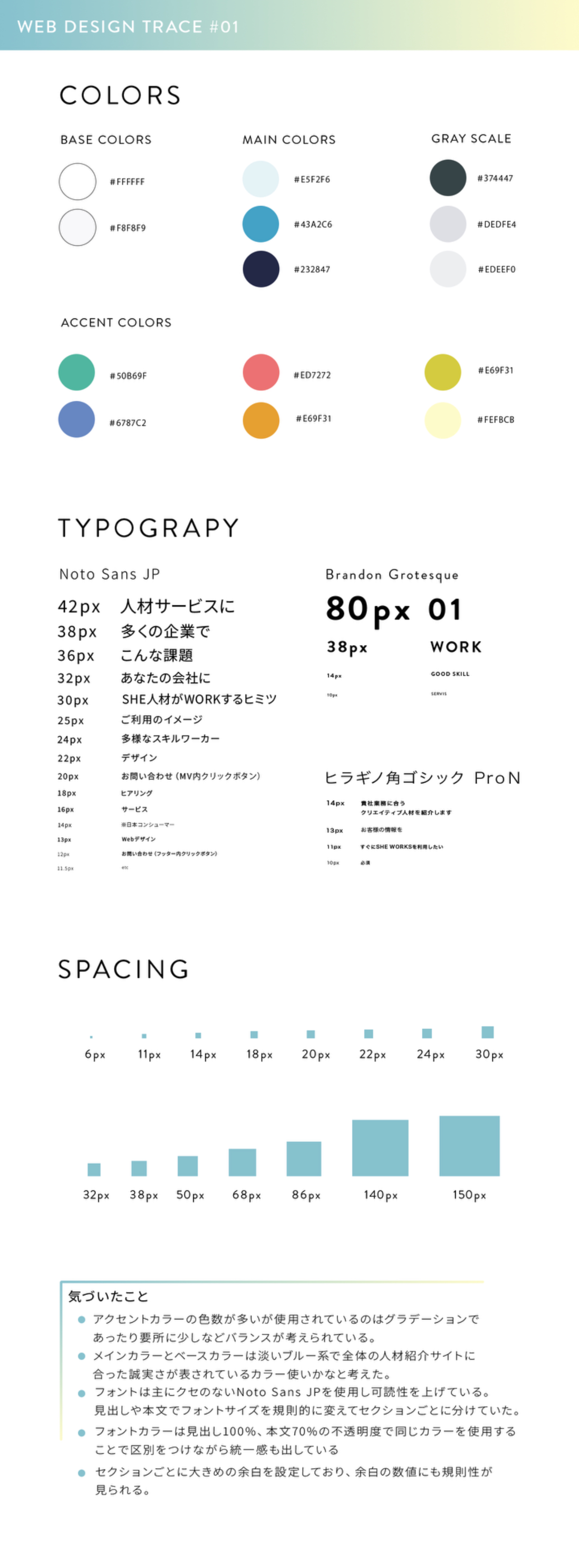 既存のWEBサイトトレースに取組みました。配色などのスタイルガイドとPC・スマホとのレイアウトの違いの分析についてもまとめました。制作時間:スタイルガイド(9時間)WEBサイトトレース(12時間)PC・スマホ比較(3時間)使用ツール:photoshop