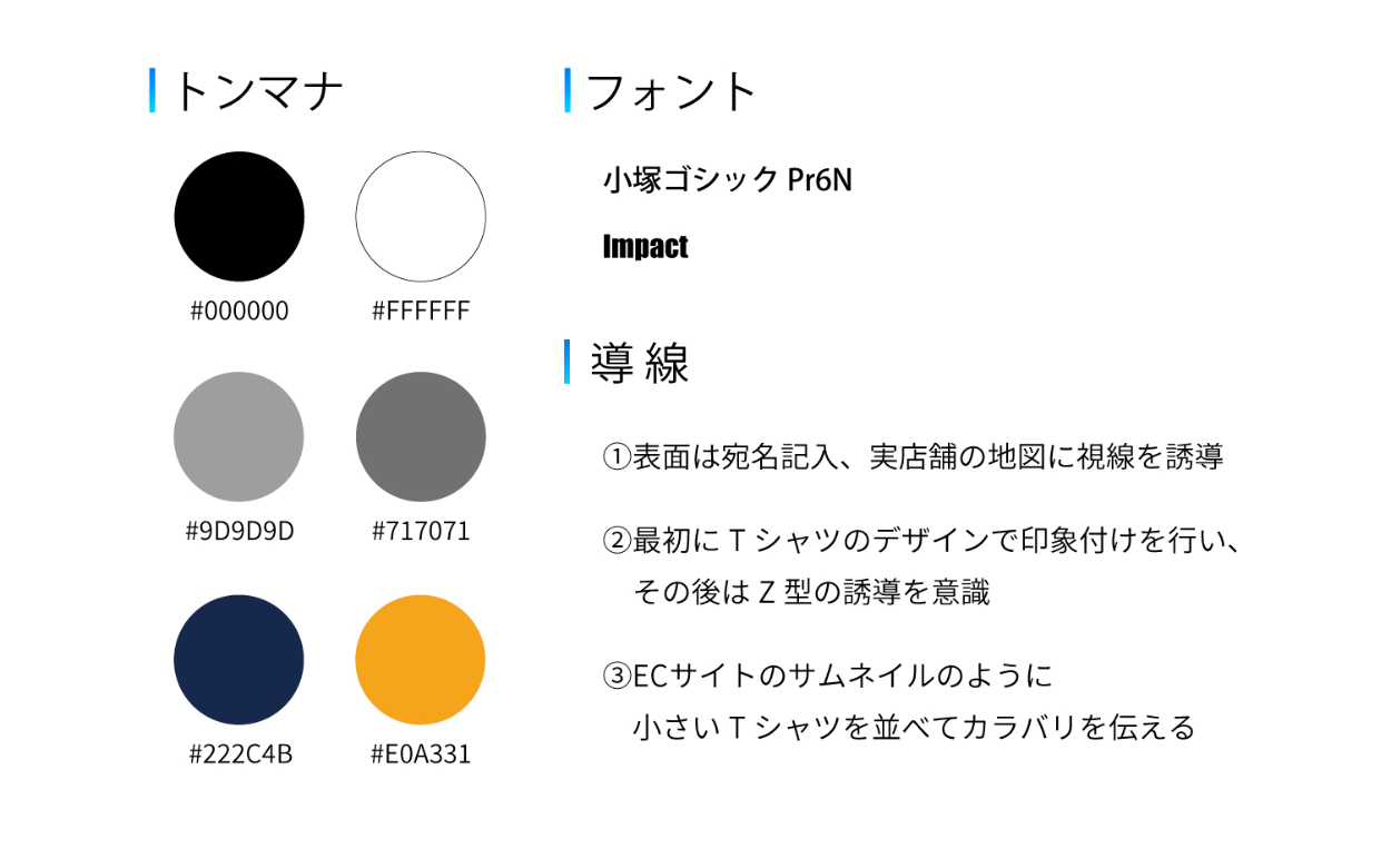 メインターゲットとなる若年層男性はいろんな情報に触れる機会が多く基本的に忙しく情報の取捨選択に日々追われています。ましてやハガキなんて3秒ぐらい見たらゴミ箱行きになりがちなモノ。その貴重な3秒でいかにメッセージを届けるかが今回の肝です。「新商品であること」「カラバリが4種類」「数量限定のドックタグのプレゼントがある」この情報を頭のどこかに記憶してもらえれば施策としての第一段階をクリアと想定してデザインを作成しました。