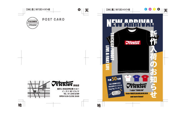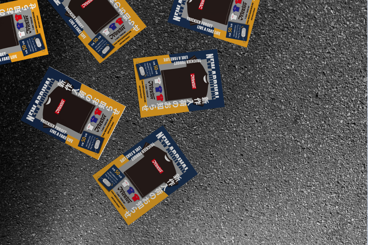 目黒クリエイターズアカデミーでの課題。若者向けメンズ服アパレルを展開する架空店舗「Trickier」のDM作成依頼を想定したグラフィックの作成。
