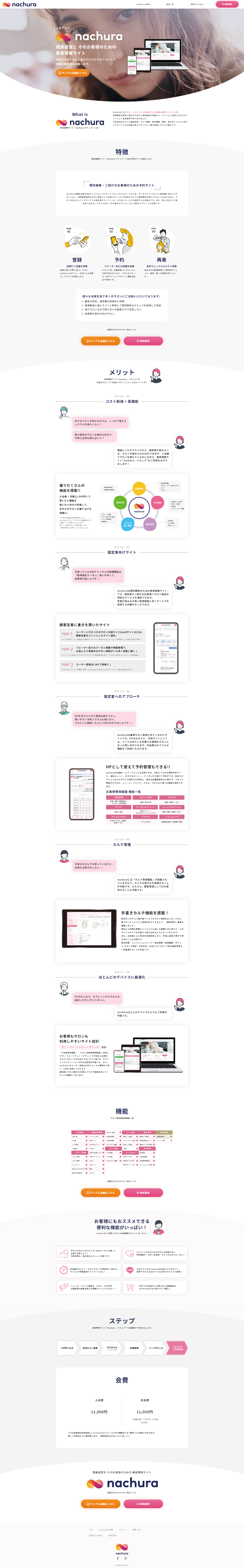 ■コンセプト:規定ロゴマークがピンク・イエロー系のグラデーションカラー、ロゴテキストはネイビー。ブランディングイメージを崩さないよう規定ロゴとカラーを合わせ、美容サロンの持つ悩みに答えながら機能紹介を行った。LPの成功パターンの構成を流用し、「キャッチコピー」「特徴・メリット」「お悩み」「掲載の流れ」「CTA」を順に配置。フォントはGoogle FontsのNoto Sans Japaneseを使用。