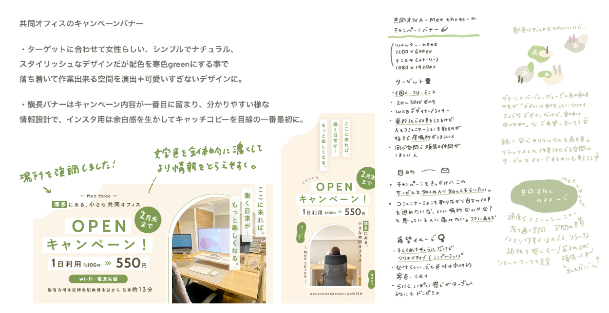 - ターゲットに合わせて女性らしくシンプルでナチュラルなデザインだが、配色をgreenにする事で落ち着いて作業が出来る空間を演出+可愛すぎないデザインに。