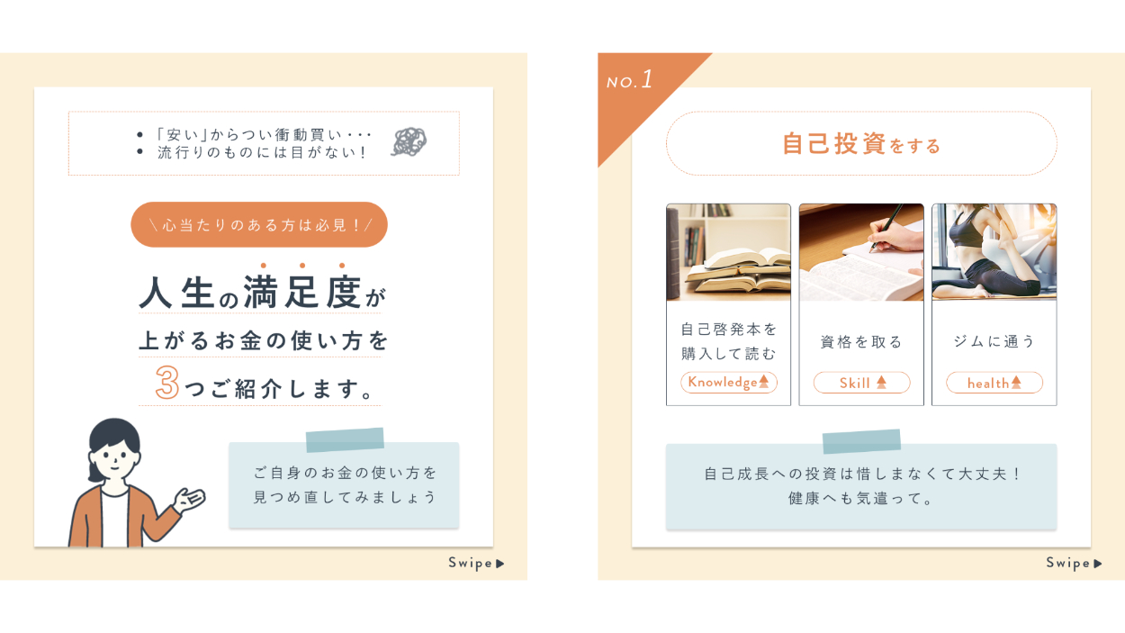 SHE株式会社の運営する「SHEmoney」公式Instagramへ掲載する投稿内容をコンペ形式で採用していただきました。(制作期間:1週間、制作時間:10時間、使用ツール:Photoshop)