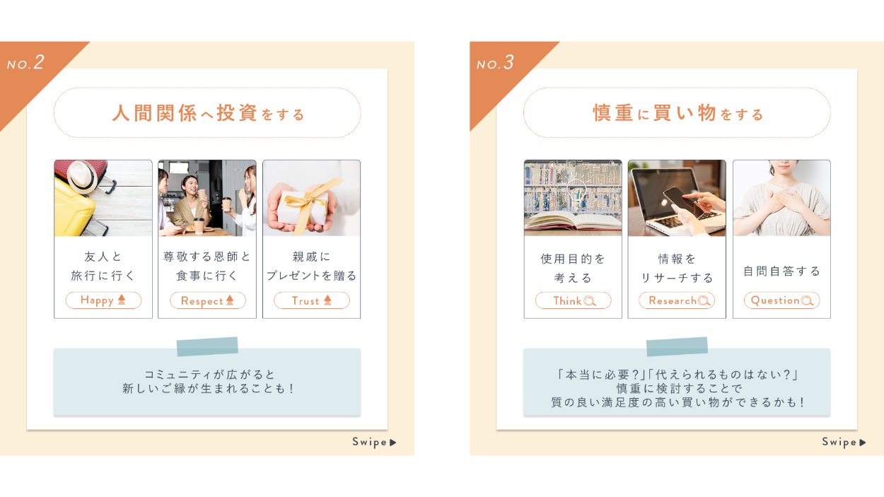 直近でSHEmoney全体のトンマナが可愛らしい印象から少し大人っぽい印象に変更になりました。あしらいなどは少なめにシンプルに制作しています。また、「満足度」が上がる要因の中でも何に影響があるのか、わかるようにボタン風のあしらいを作成しました。