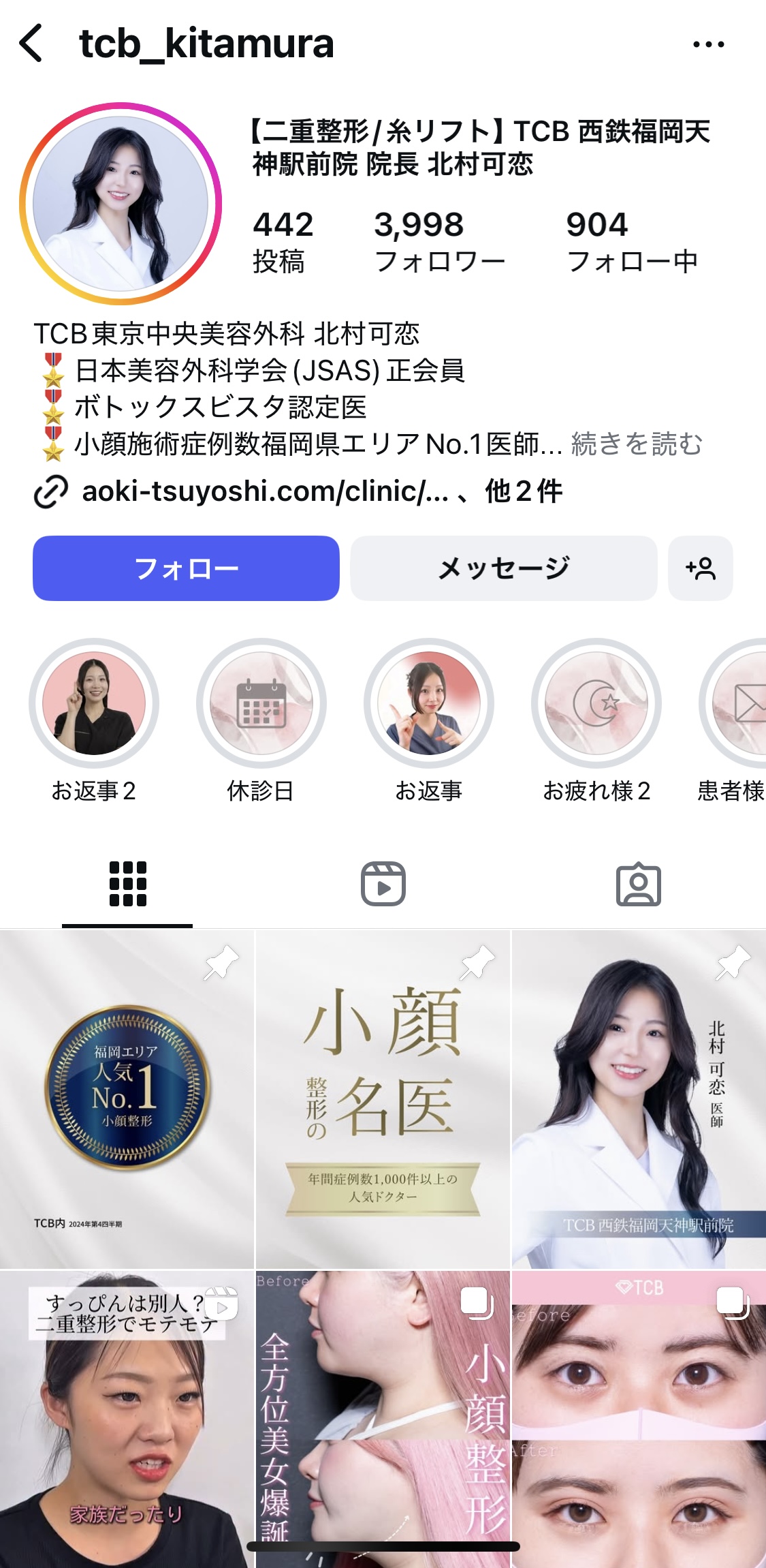 西鉄福岡天神駅前院の北村院長アカウント(https://www.instagram.com/tcb_kitamura?igsh=MW1jZ2JnczVyYjlwMA==)Instagram運用において、ドクターのブランディングと投稿内容にズレがあるとの分析結果を受け、本社より運用支援を担当。SNS運用課のメンバーとして、現地担当者に向けたコンセプト設計から投稿テンプレート作成までを一括で実施。改善後は投稿の平均いいね率が1.3倍に向上し、ドクターの魅力がより正確に伝わる運用へ。
