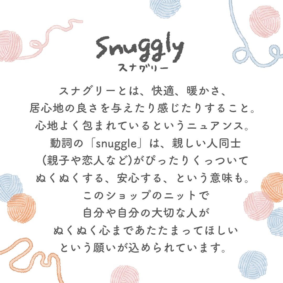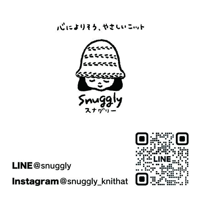 snuggly ロゴデザイン 尾迫 洋子 Designer&illustrator OVERVIEW 心によりそう、やさしいニット。日常を特別にする、とっておきのおそろい帽子と小物のネットショップ「snuggly」のロゴ・ショップカードをデザインしました。 YEAR 2024 SNS投稿用ロゴ展開ショップカード