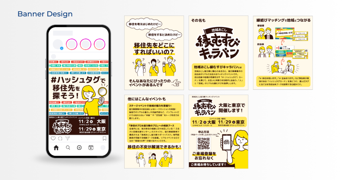 マッチングイベント「地域おこし縁むすびキャラバン」の集客を目的としたInstagram広告バナー。当初は公式Instagramへのみの掲載予定だったが、