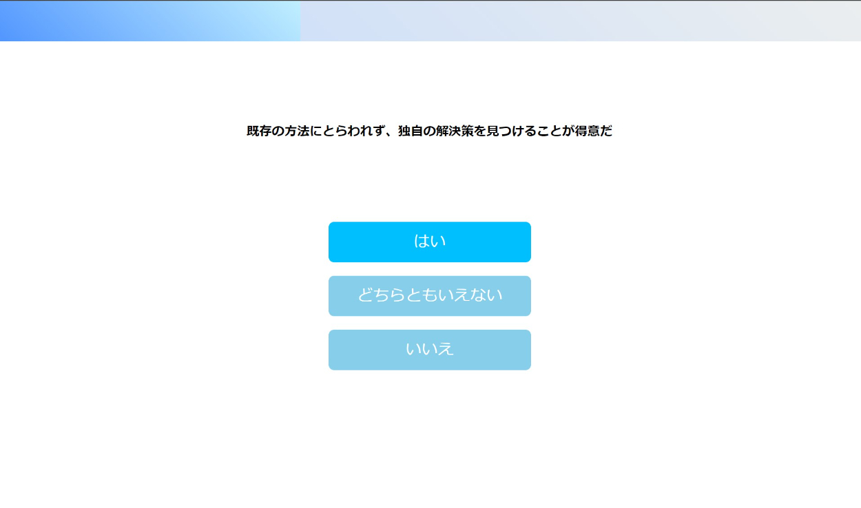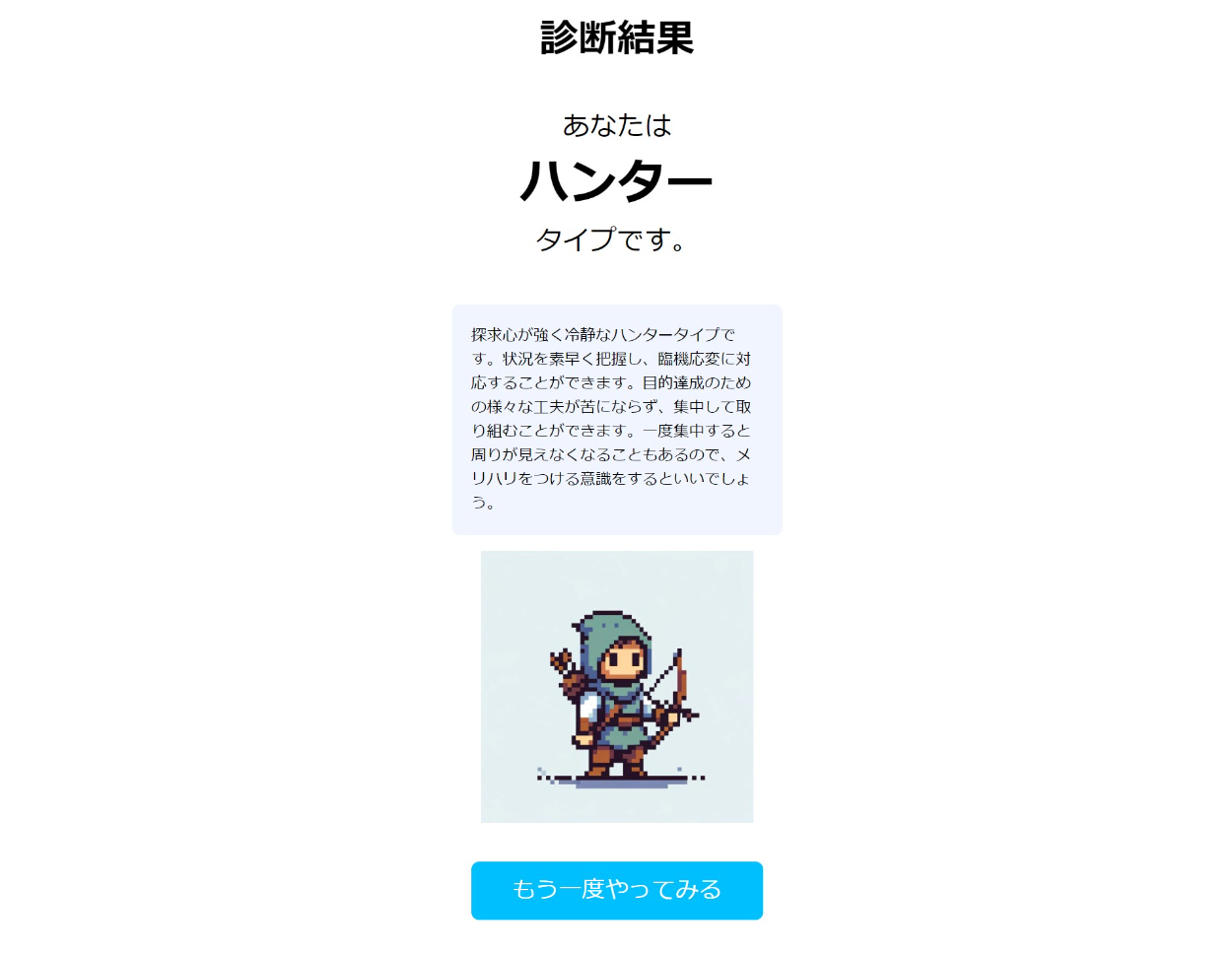 もっと凝るなら結果として出る職業パターンを増やし、回答傾向のグラフをChart.jsなどで表示してもよかったかと思います。