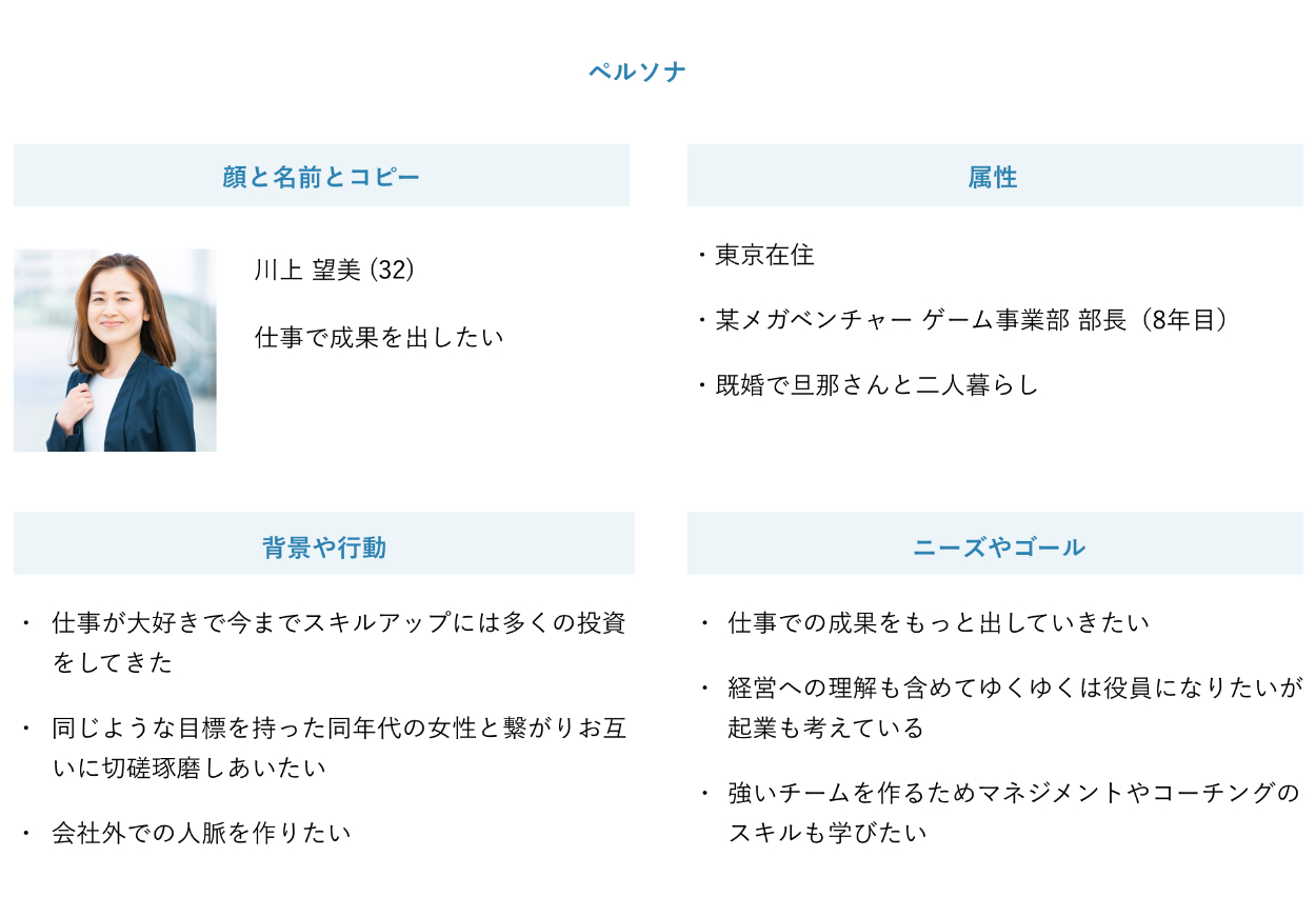 女性向けのビジネススクールを展開している。会員は20~30代の女性が多く、キャリアアップのためにビ ジネススキルを学び、さらにそのアウトプットの場として定期的にビジネスコンテストなどのイベントも 開催されている。