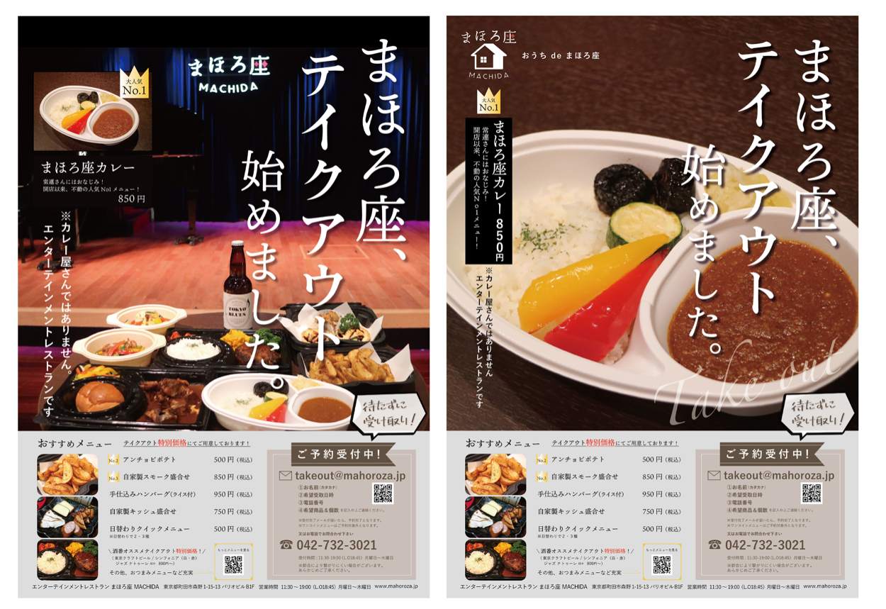 まほろ座テイクアウトメニュー作成 おのでらちほ デザイナー OVERVIEW 2020年6月より開始のテイクアウトチラシ・メニューを作成 YEAR 2020 *テイクアウトチラシ作成(製作期間3日)テイクアウト開始のお知らせ、認知を最優先に予約フォームなどでWEBへ誘導*店頭・WEB設置メニュー作成 WEBSITE