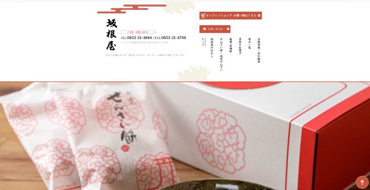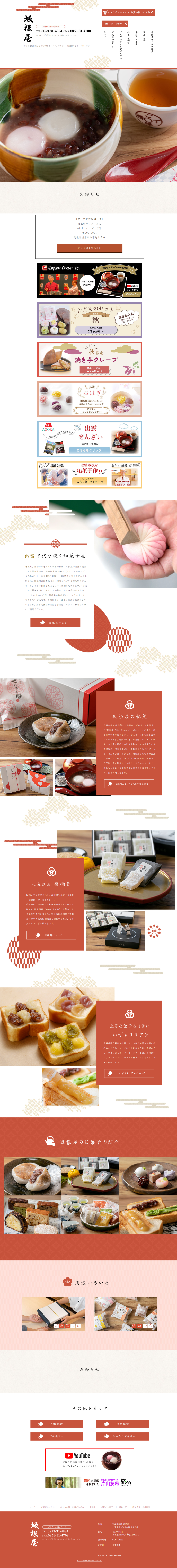 WEBでは老舗和菓子屋らしいイメージを一新。縁結びの地である出雲と、そこで展開するぜんざい餅の小豆のカラーにちなみ赤でビジュアル展開。またもう一つの推し商品「宿禰餅」は由緒あるお菓子なのでブラックを入れるなどページごとに見せ方も工夫しました。