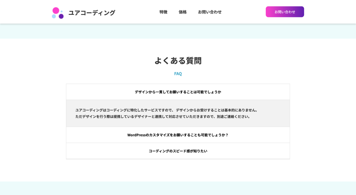 スクロールアニメーションやアコーディオン、スライダーなどを入れており