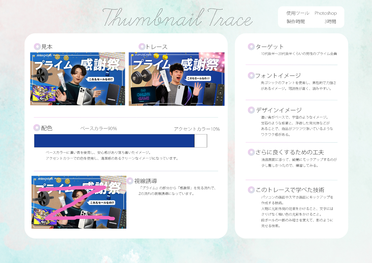 デザインの言語化・分析の為に、サムネイルのトレースを行いました。 記載内容│配色/視線誘導/ターゲット/フォントイメージ/デザインイメージ/さらに良くするための工夫/このトレースで学べた技術 所用時間│3時間 使用ツール│Photoshop
