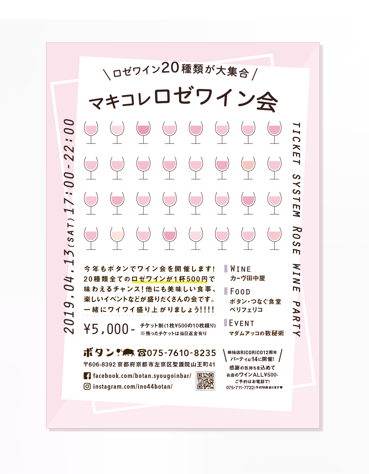 飲食店イベントポスター のぞみ webデザイナー/グラフィックデザイナー OVERVIEW 飲食店のワインイベント告知ポスターを制作いたしました。 YEAR 2019 飲食店のワイン会ポスターをデザインいたしました。「20種類のロゼワインが飲み比べられること」が特徴のイベントを色味の違うワイングラスを並べることで表現しました。