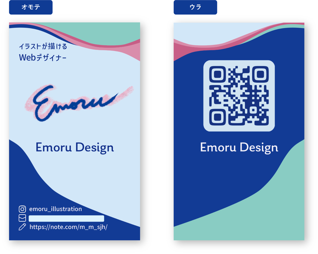 名前部分を手書きで作成し、都会的な雰囲気の中にも親しみやすさを感じさせるデザインを心がけました。しかし手書きのみだと読みづらいため、"Emoru Design" という屋号も付記しました。