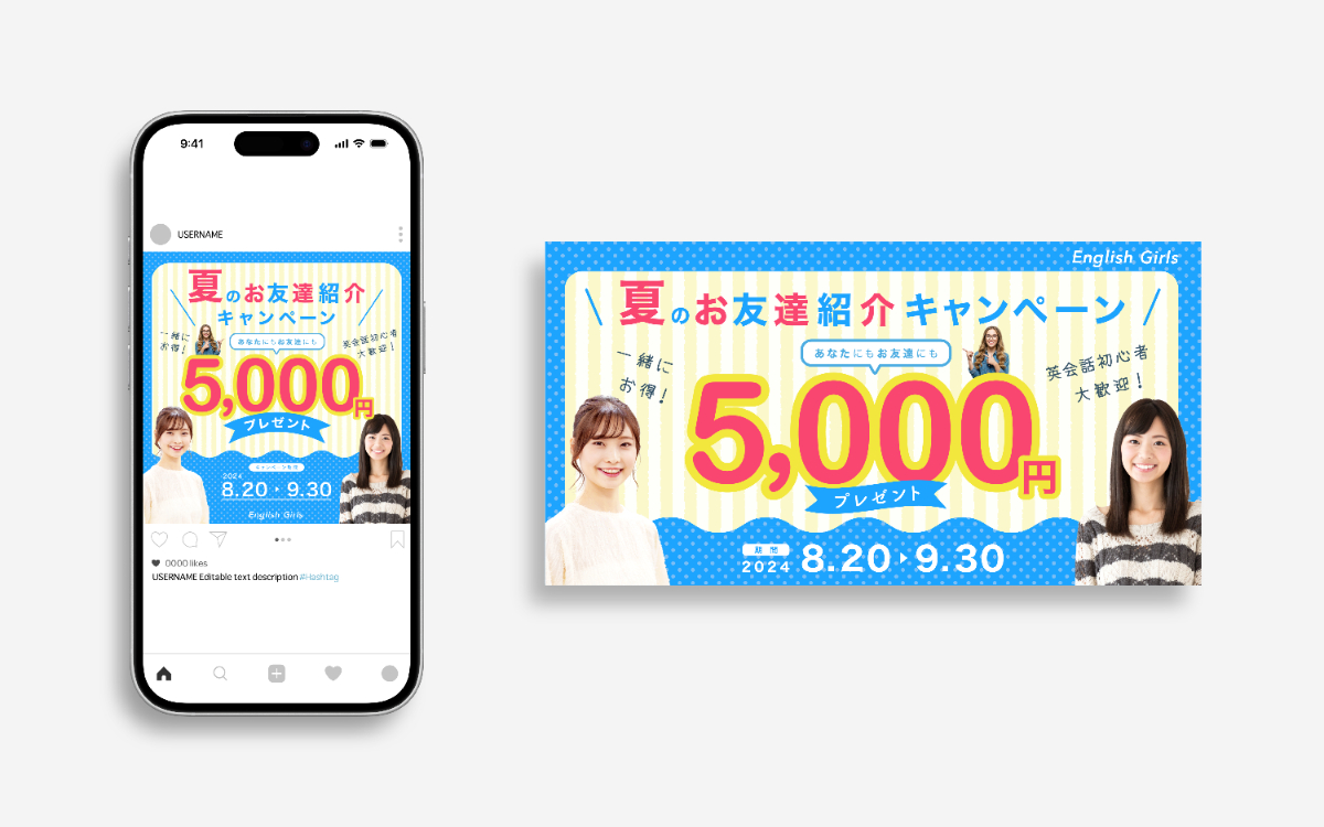 20代女性をメインターゲットとする英会話スクール「English Girls」の期間限定・お友達紹介キャンペーン告知用SNSバナーを制作(SHElikes課題)新規入会増加を目的としInstagram・X(旧Twitter)での配信を想定したビジュアル設計をしました。