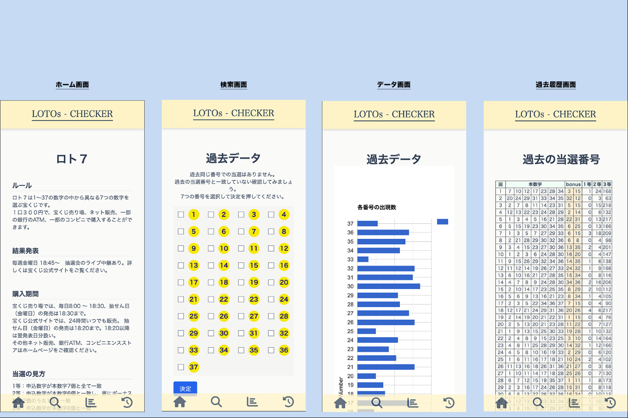 Loto-cheker k_shun OVERVIEW ロト7に関する情報 YEAR 2023 <概要>Ruby on Railsを使ったポートフォリオロト7の番号選びをする際に、楽しく選べるようにと作成Ruby 3.1.0Rails 7.0.6CSSフレームワーク - Tailwind CSSJavaScript - Hotwireデータベース - PostgreSQL開発環境 - DockerGithubCI/CD - Github Actionsサーバー - Herokuテスト - RSpec<画面> WEBSITE