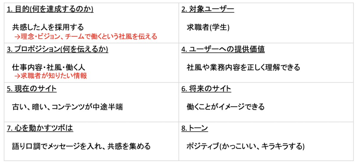 以前まで「将来の幹部候補生」を採用するという目的から、ここ数年「理念に共感した人材」を採用するという目的に変化していることから、内容として「理念・ビジョン・社風」を伝えつつ、今働く社員からの生の声を入れました。