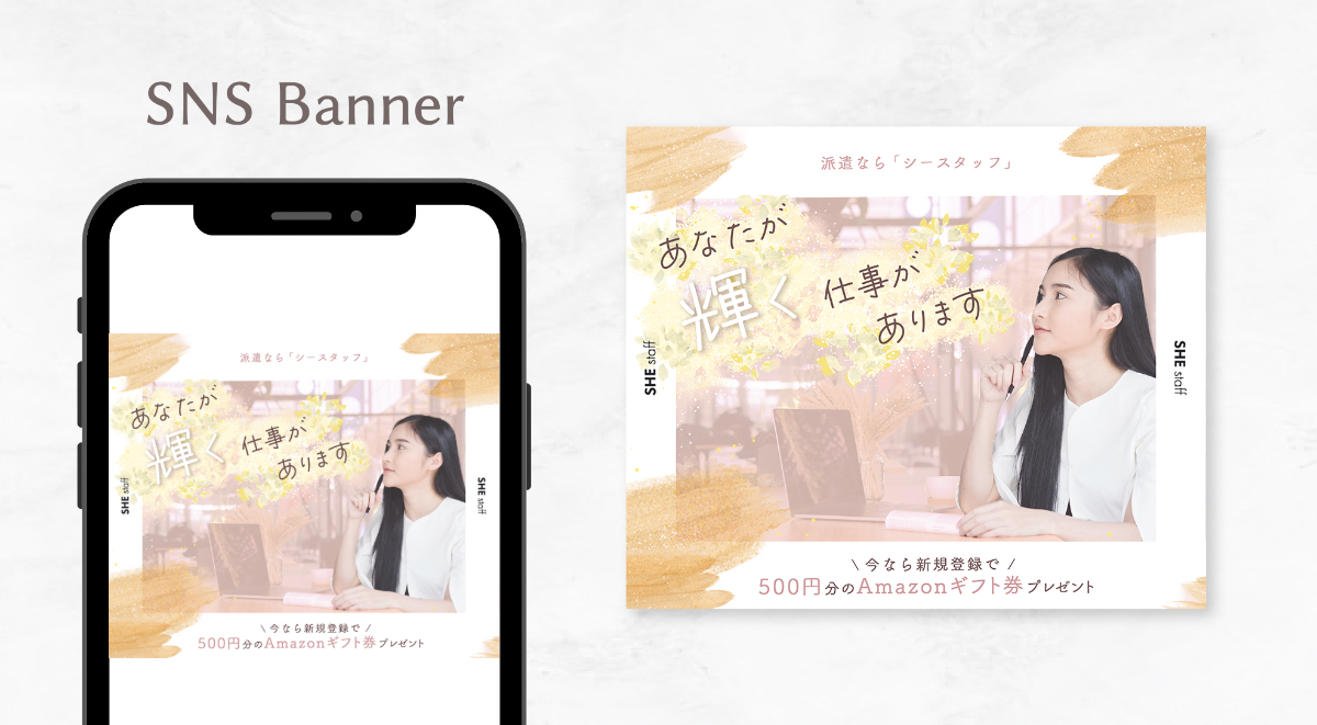 架空の人材派遣会社の新規登録者数を増やすためのバナーの自主制作です。 Googleに出稿し、Webサイト上に掲載されるバナーを想定しています。