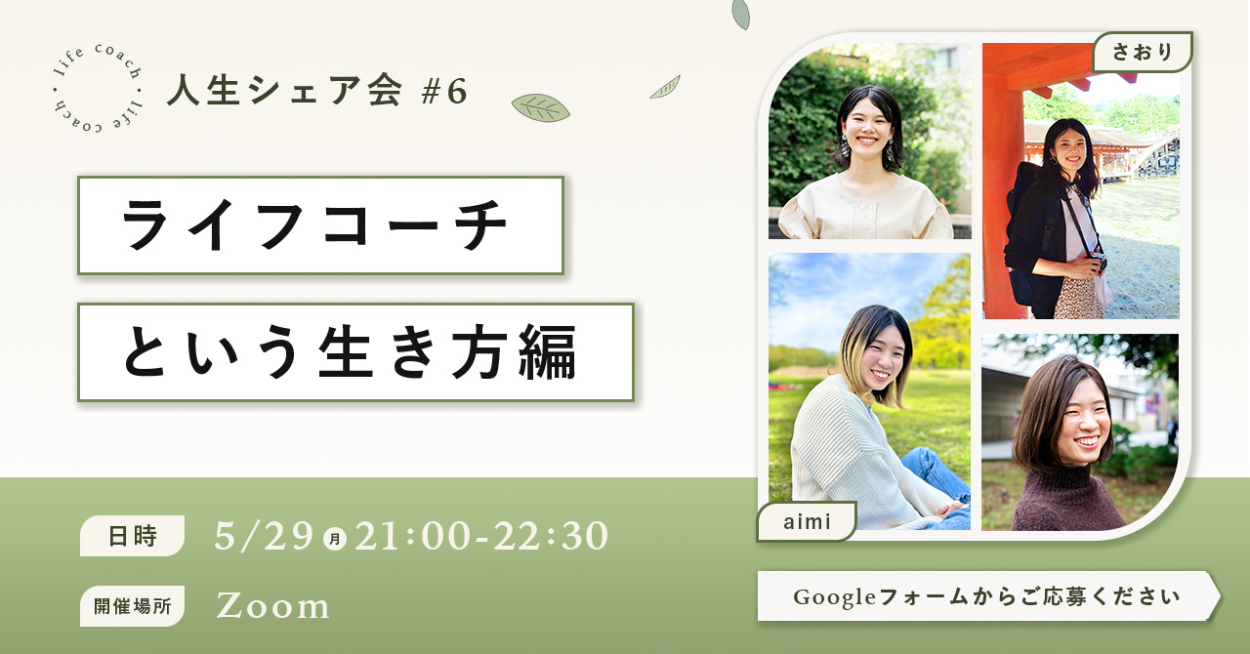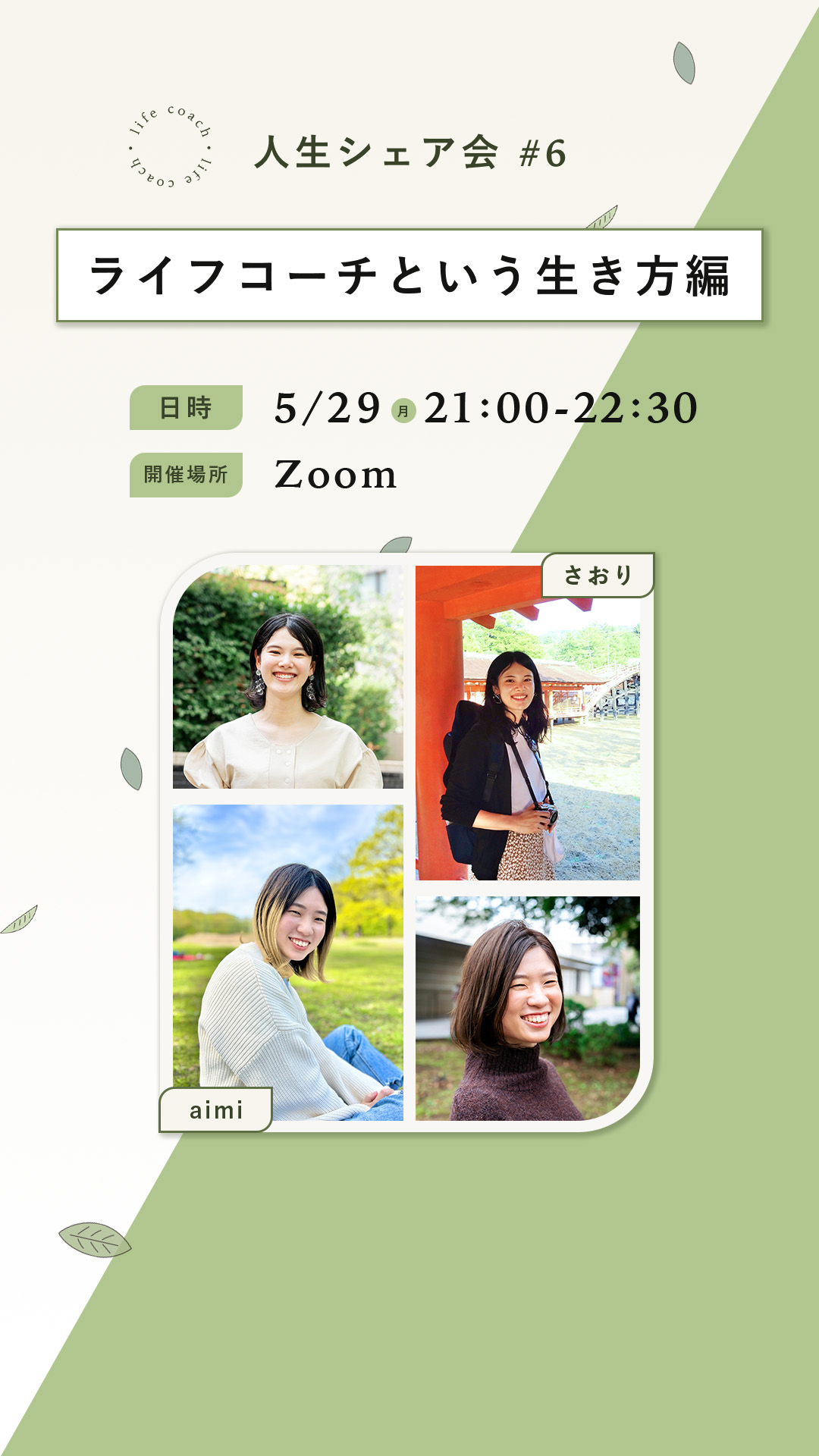 - 開催日が5月なので新緑のイメージとライフコーチの自然体な印象を引き出すための配色でデザイン。(緑・ベージュ・黒)