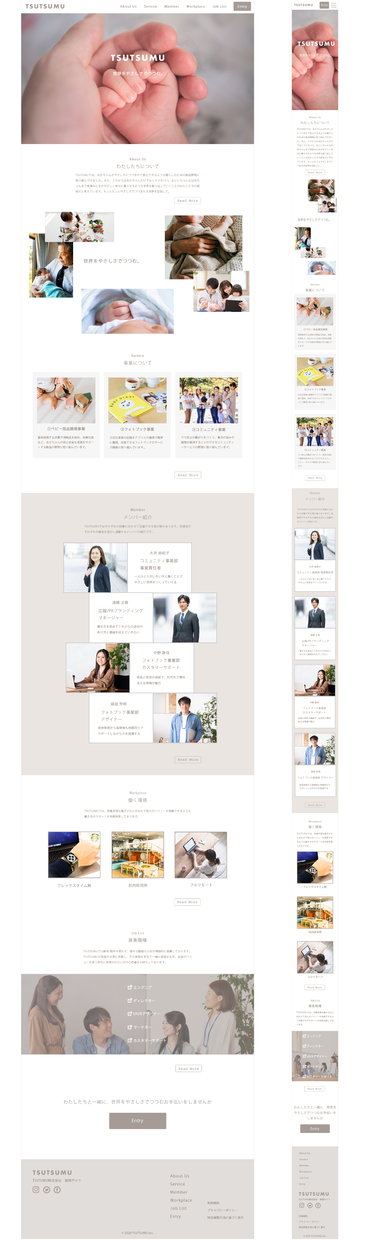 クライアント(ベビー用品をメインにママ向けコミュニティサービスやフォトブック事業を展開する企業)からの案件依頼という想定で0からワイヤーフレーム/デザインカンプを制作したのちコーディングを行いサイトを実装する