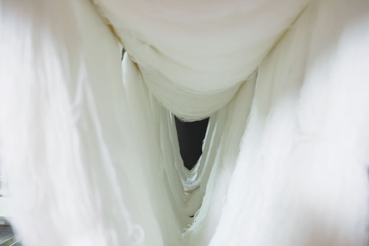 糸で覆われている真っ白な空間の中で木の幹に腰掛け、上を見上げ、切り取られた空を見る。