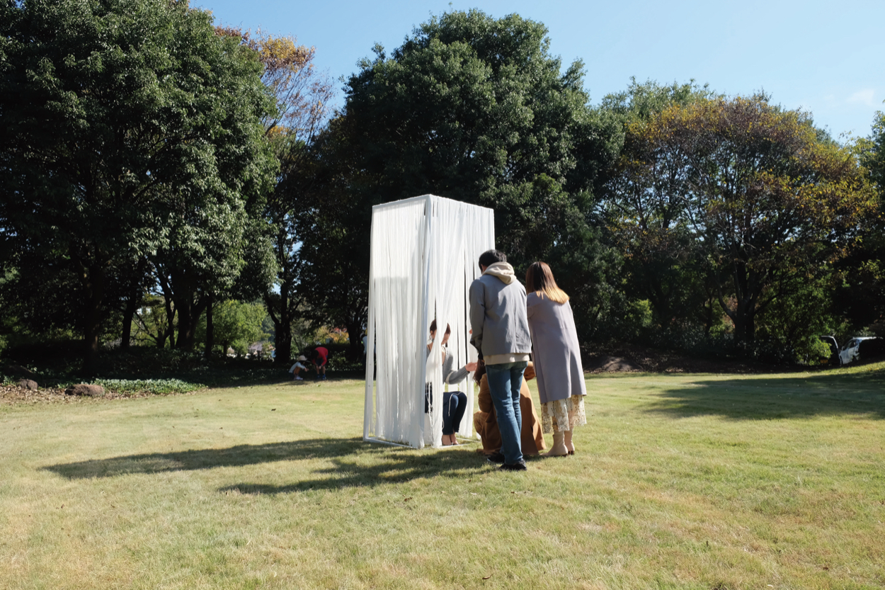 木材と糸を使い制作した「空 -kuu-」は、何も考えず切り取られた空を見る、非日常的な休憩場所を経験できるインスタレーション作品です。緑の中、風でたなびく純白の糸に囲まれ、外界から遮断された空間で空を見上げていると、まるで魂が抜け落ちるかのように心も体も落ち着いていき、頭が空になってゆきます。