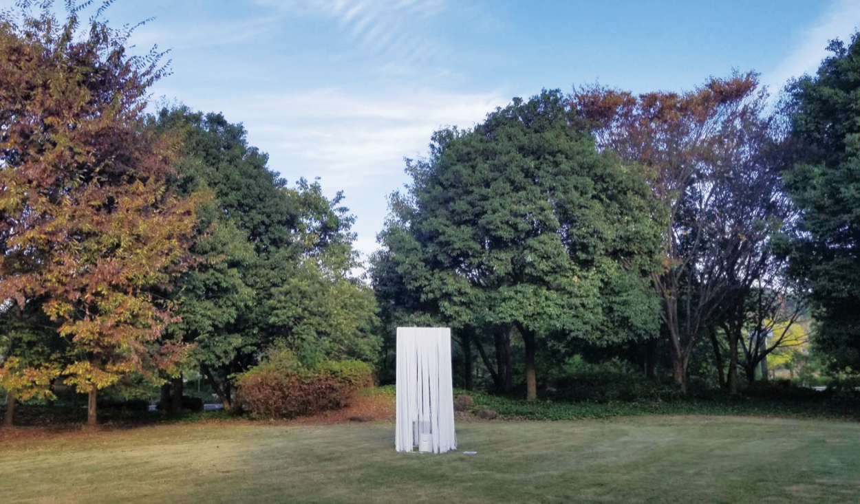 物理的に周りを遮断し、文化祭の騒がしい場所からは少し離れた人の少ない自然の中に設置することで、ひとりになる空間を作る。そして入った人は自然と穴の空いている上を見上げる形になり、絶えず変動する空を見ることで、それ以外の思考を少しでも止める。そして、白という軽い印象の糸が風でたなびくことで思考が空に飛んでいくような心地よさをを感じさせる。また、全体を糸で取り囲むだけだと、心理的に入るのが難しいと考え、入り口とした面の地面から40cmほど離れた場所の糸を切り、入り口のようにして中に誘導しやすくしました。