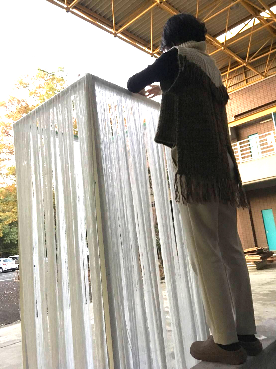 まず木で縦2M20cm、横4辺80cmの立方体を作り白いペンキで塗り、純白まで漂白した光で輝く糸を約1万Km取り付けました。屋外でのインスタレーションということもあり、風や少しの加圧では倒れないよう、地面に釘を深く刺して固定し、安全を確保しました。