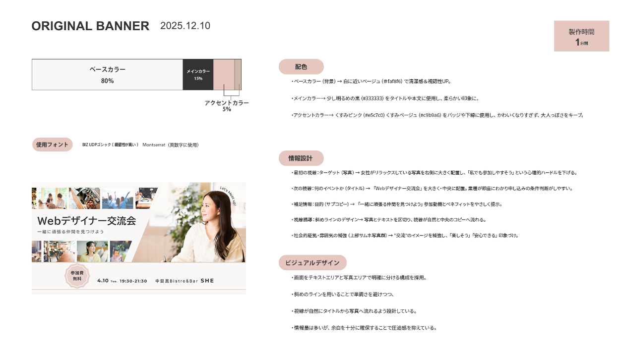 本バナーでは、Webデザイナー交流会というイベントの特性を踏まえ、「どんな人が参加するのか」「自分も馴染めそうか」 が直感的に伝わることを最優先に設計した。