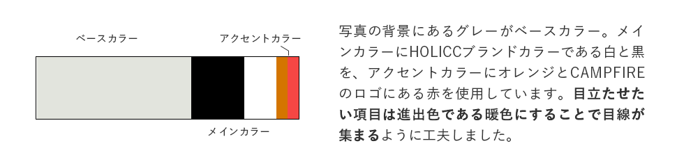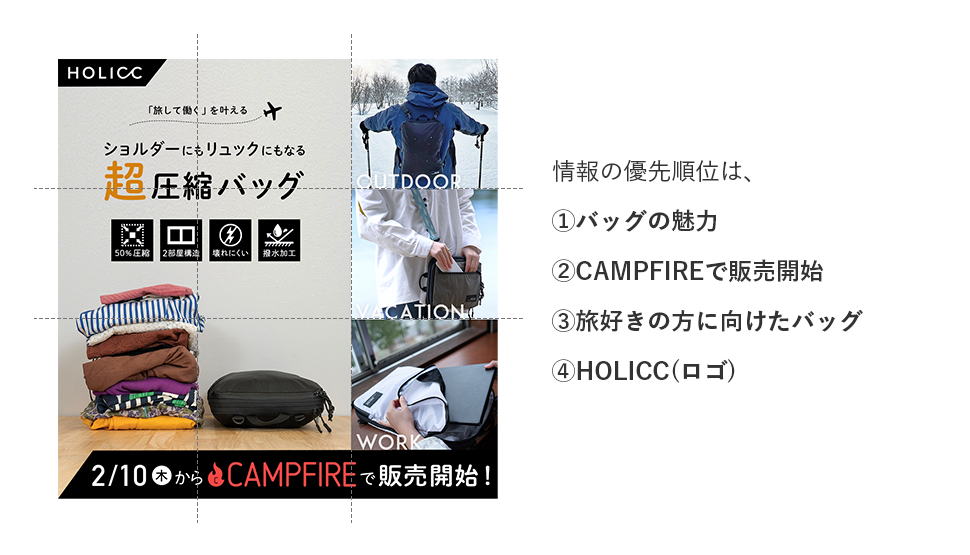 全体は縦に3分割し、左3分の2にテキスト+バッグの写真、右3分の1に使用イメージの写真を使用し、伝えたい情報の優先順位づけを行いました。一番目立たせたい「2/10(木)からCAMPFIREで販売開始!」は最下部に配置し、最後に視線が集まるようにしています。