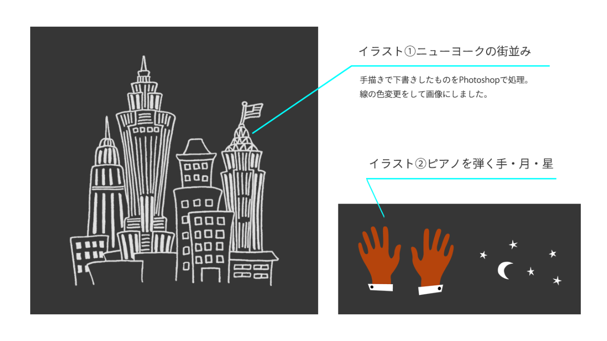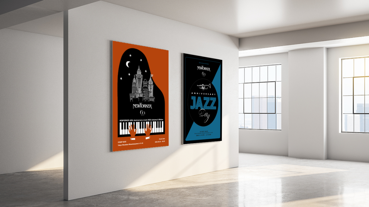 - JAZZライブの告知ポスターのようなデザインで2種類制作しました。1つはピアノを背景に、ニューヨークの夜景をモチーフにしたイラストを乗せて、ブランドロゴを大きめに配置しました。イラストを使うことで程よいポップさを感じるデザインに仕上げました。