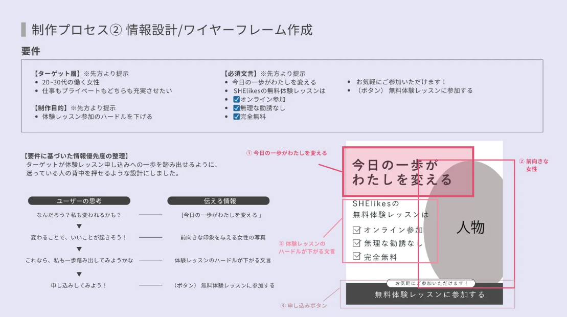 ・「今日の一歩が私を変える」という文字を女性の目線の先に配置することで、前向きなイメージが出るようにしました。