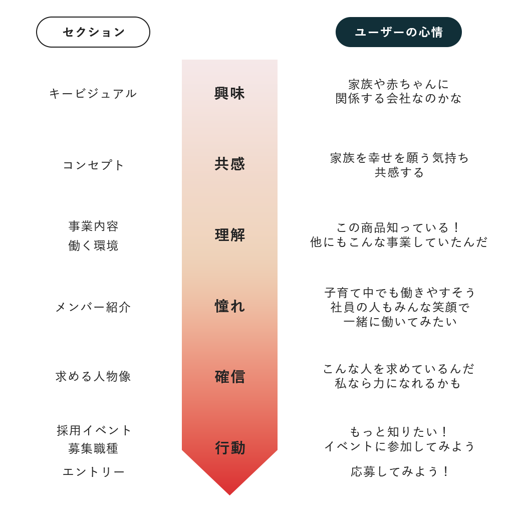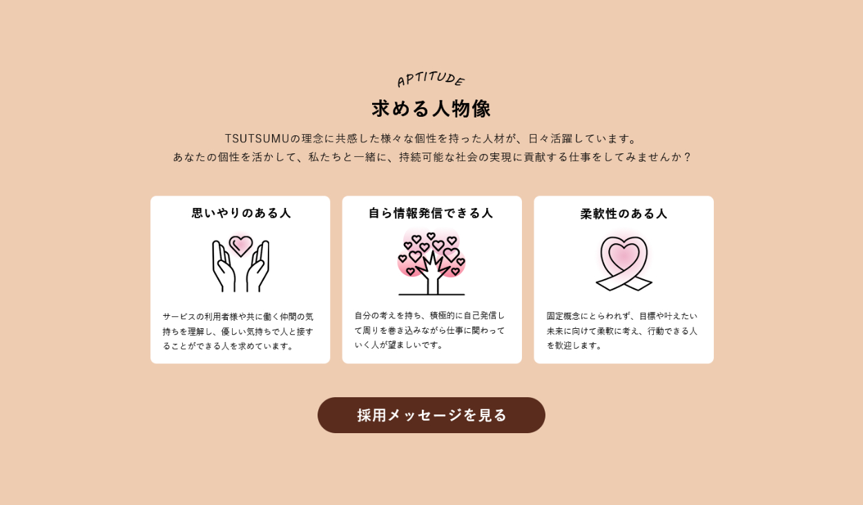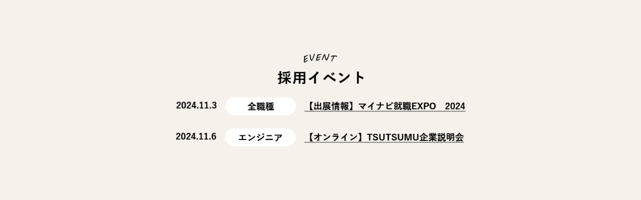 求める人物像・採用部からのメッセージを読むことで求職者側は自分と合う会社なのか判断材料になり、また企業側にとっても採用イベントなどの交流の機会へ導線を作っておくことで興味をもった候補者の中からよりカルチャーフィットする人とのマッチングを図ることができると考えました。