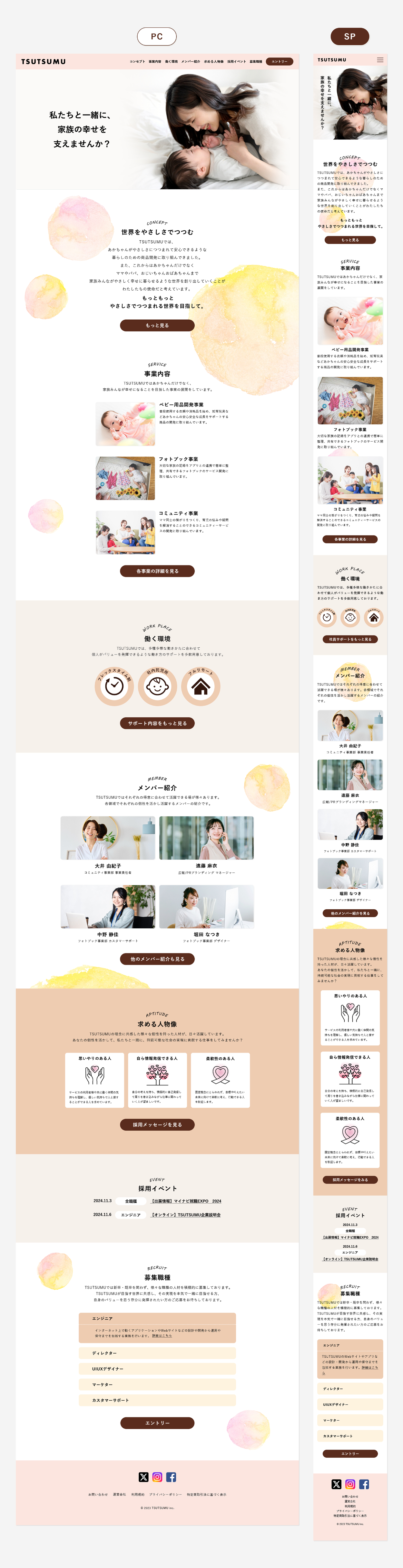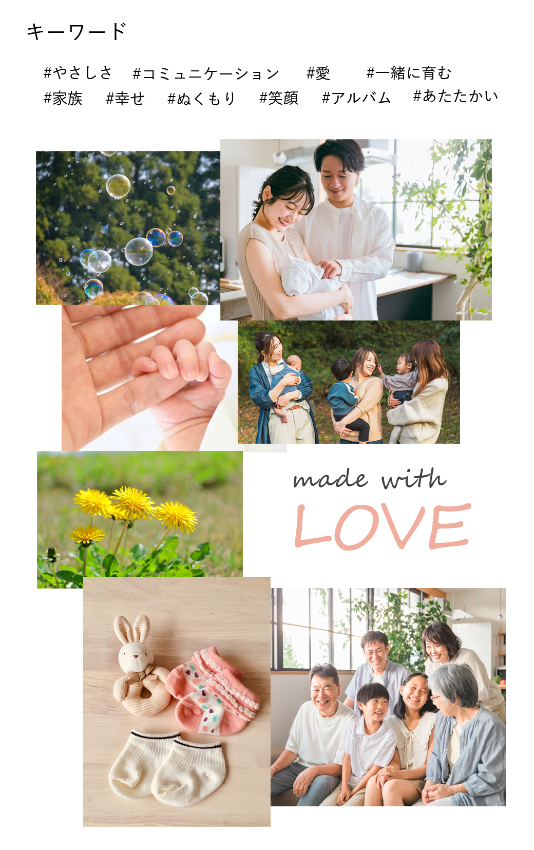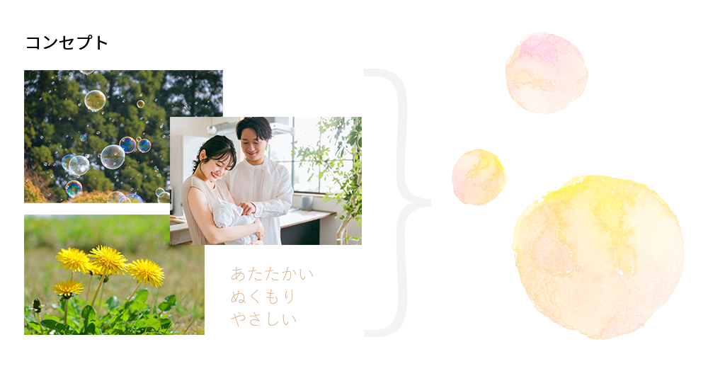 ムードボードにあるシャボン玉やたんぽぽ、家族写真の画像からインスピレーションを受け、背景のシャボン玉の画像を作成しました。だれもがなつかしさを感じる原風景のモチーフを入れることで共感を呼び、親しみやすさのあるサイトになっています。