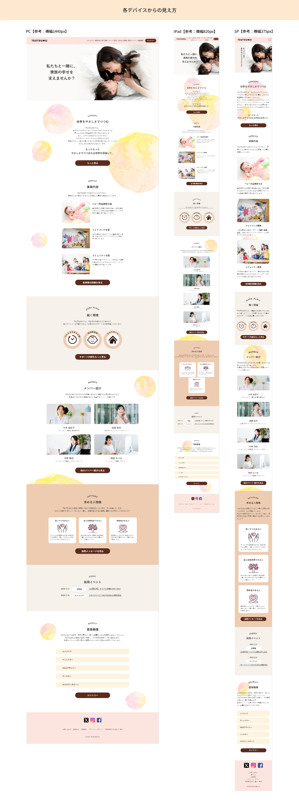 実際に制作したサイト(TSUTSUMU)で検証ツールを使い、横幅を変更した際の見え方です。デザインカンプではパソコン版(横幅1440px)とスマートフォン版(375px)のみ作っていますが、1度目の実装で375px~1440pxの間、iPadなどのサイズになった時に背景やデザインが崩れてしまうところが多々ありました。