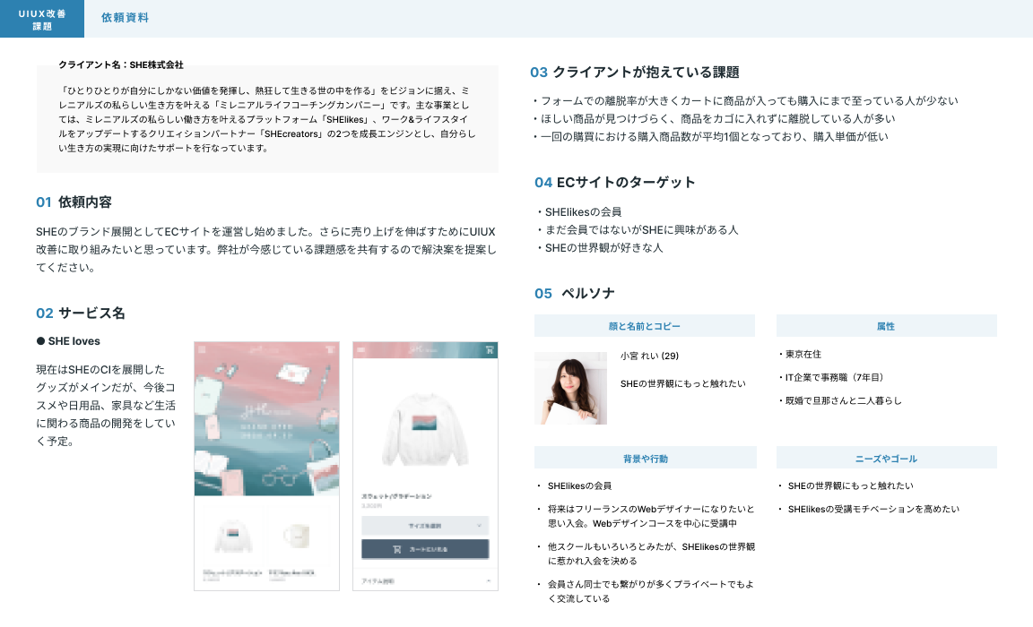 上記資料の「03 クライアントが抱えている課題」のうち2つを選び、UIの改善と提案資料を作成を行う。